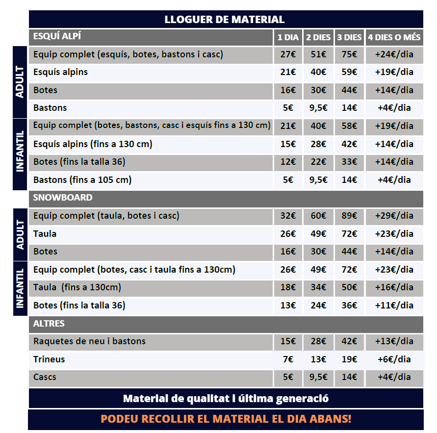 Confirmada la reserva us reservem el material i el podeu venir a buscar el dia abans per anar més relaxats a pistes.